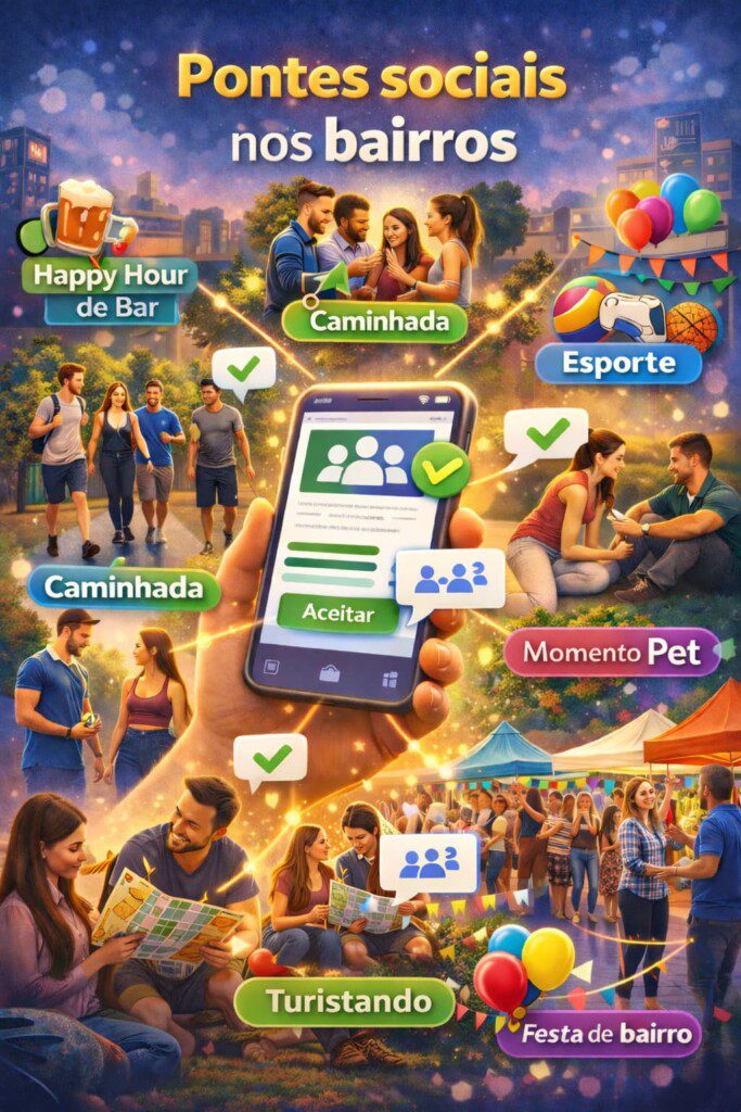 Aqui as interações sociais ganham força — e saem do digital para o real. Um espaço onde intenções viram encontros, e encontros viram histórias. Crie ou entre em pontes no seu bairro, reúna pessoas com a mesma vibe e transforme afinidade em presença.